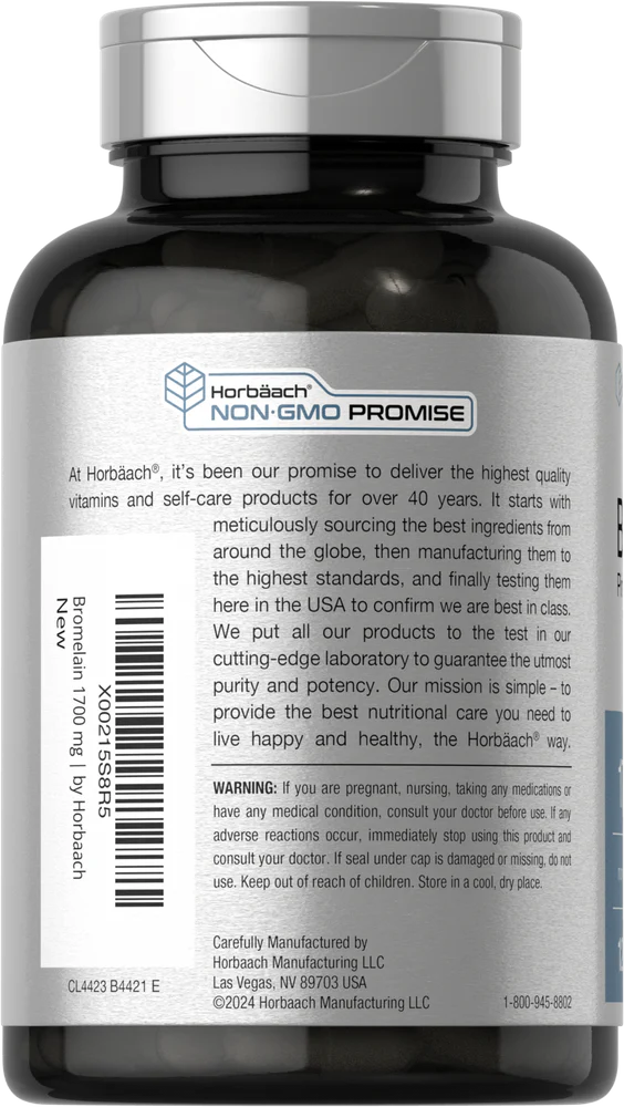 Our Bromelain supplement is derived from the finest source of pineapple, providing 1,700 mg of Bromelain from 400 Gelatin Digestive Units (GDU) per gram per serving, in non-GMO, quick-release capsules. Get superior support from this powerful enzyme today with our 120-capsule supply and receive quality you rely on from the number one leader in supplement innovation, Horbaach!