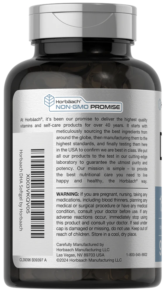 Support your routine with Horbaach DHA! This highly innovative formula provides 1,500 mg of DHA per serving in super convenient enteric coated softgels. Our gluten-free and non-GMO formula contains no artificial flavor or preservatives, delivering just what you need to help meet your supplement goals.