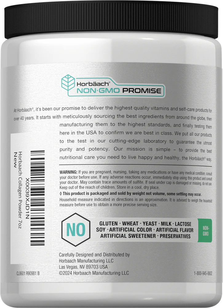 Horbaach Collagen Powder is the ultimate daily source of Collagen for men and women. Our gluten-free and non-GMO formula features 6.7g of Collagen Types 1 & 3 in approximately one scoop of powder. We use a premium source of Grass Fed Collagen that best suits your needs. Unflavored powder mixes easily with hot or cold drinks, smoothies, or your favorite recipes, so you can enjoy the benefits of Collagen your favorite way every day!