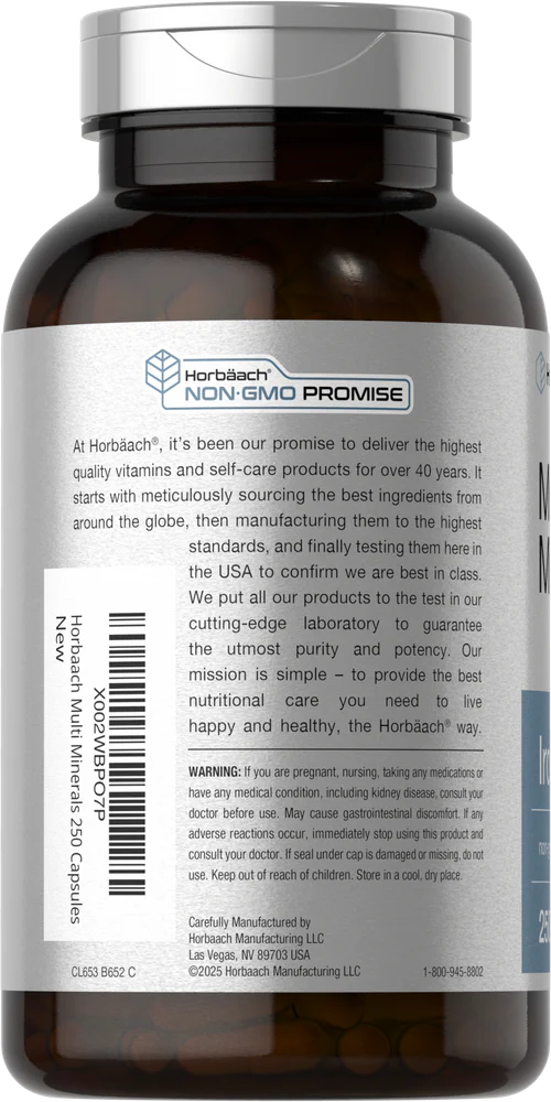 Horbaach Multi Mineral Complex is scientifically crafted with a wide range of nutrients for daily support. Formulated without Iron, our supplement supplies Calcium, Iodine, Magnesium, Zinc, and more in convenient quick-release capsules. It's gluten-free, non-GMO, and the ultimate mineral formula for a balanced routine.