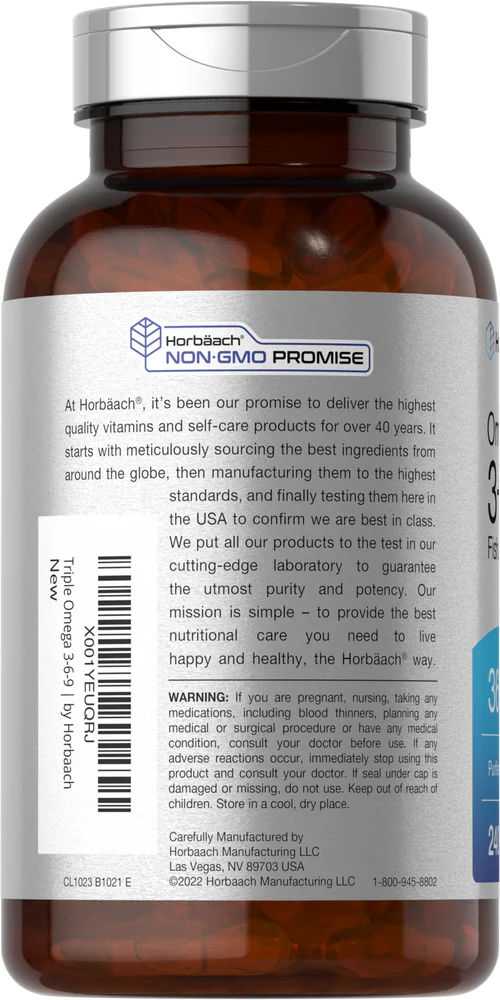 Horbaach Fish, Flax, and Borage Oil is the ultimate triple-action Omega supplement, bringing you essential Omegas in convenient quick-release softgels. Our high quality formula features the finest source of fish, flaxseed, and borage oil, a natural source of EPA, DHA, and other beneficial fatty acids. We hold our omegas in the highest regard, purifying to eliminate mercury and ensure exceptional quality for your routine. Receive superior value today with our 240-softgel supply!