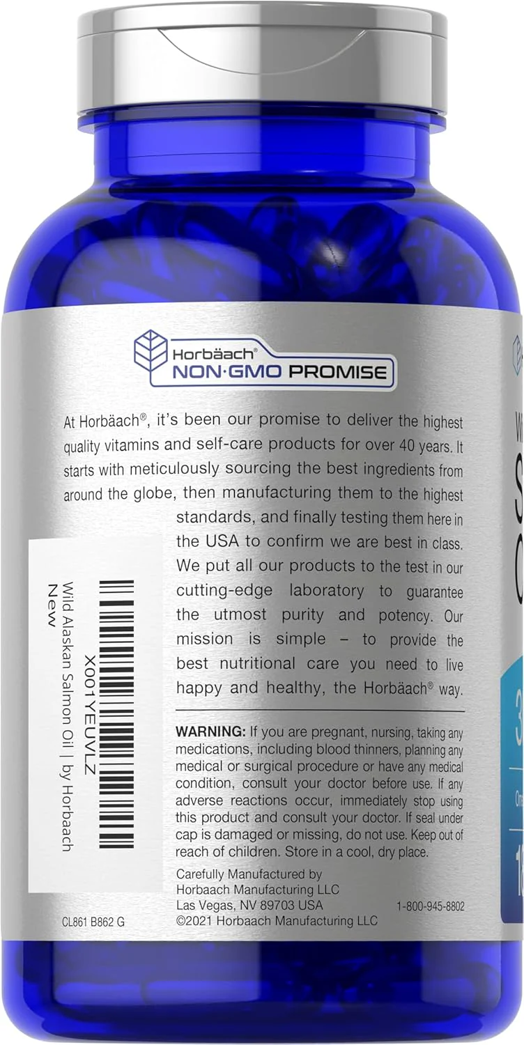 Horbaach's Wild Alaskan Salmon Oil is the complete Omega-3 supplement, bringing you 3,000 mg of Wild Alaskan Salmon Oil per serving in convenient quick release softgels. Our ultimate high-quality formula features the finest source of Salmon Oil, a potent source of EPA and DHA. We hold our Omega's in the highest regard, purifying to eliminate mercury and ensure exceptional quality for your routine. Receive superior value today with our 180-softgel supply!